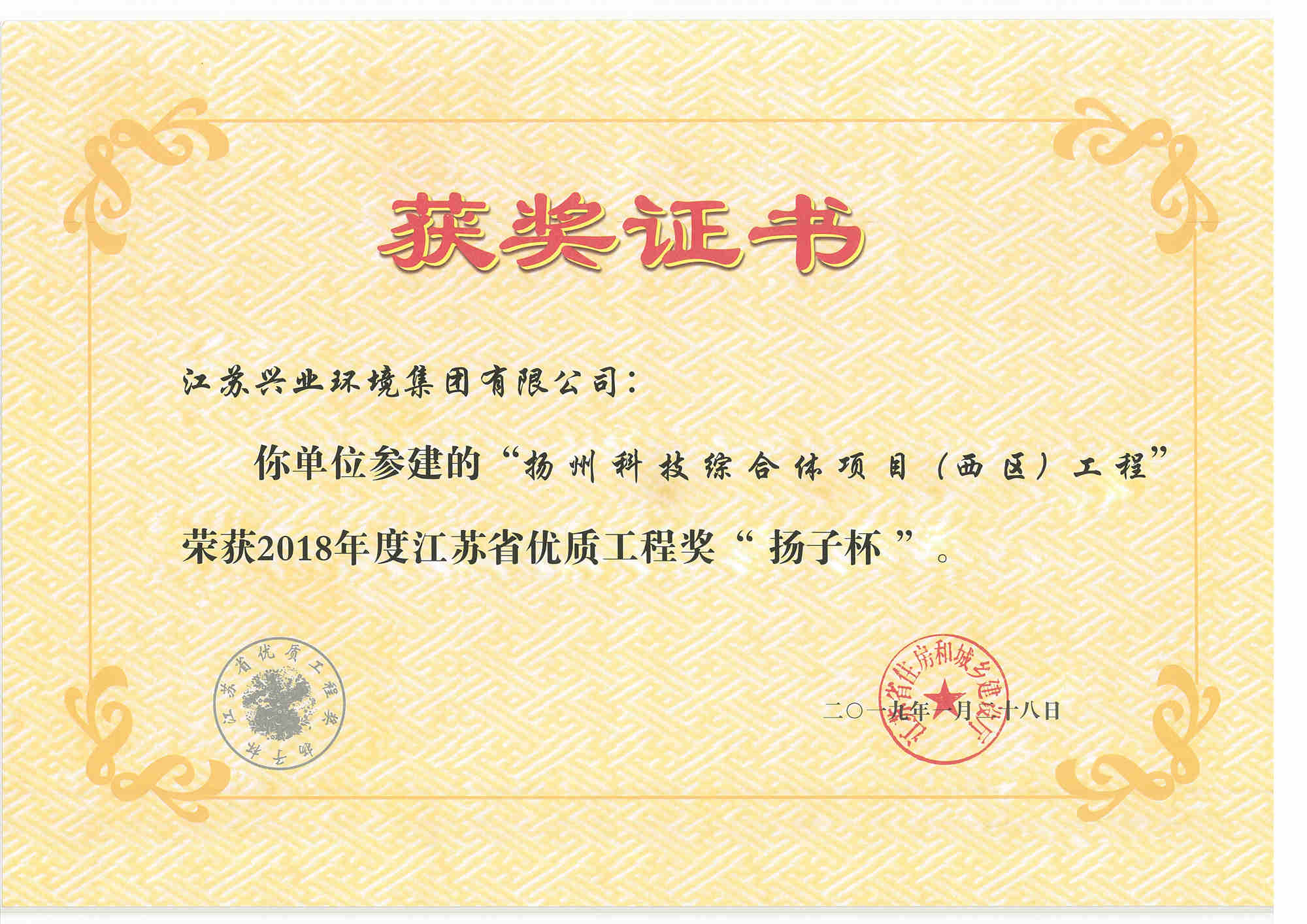 2018年江蘇省優質工程獎“揚子杯”揚州科技綜合體