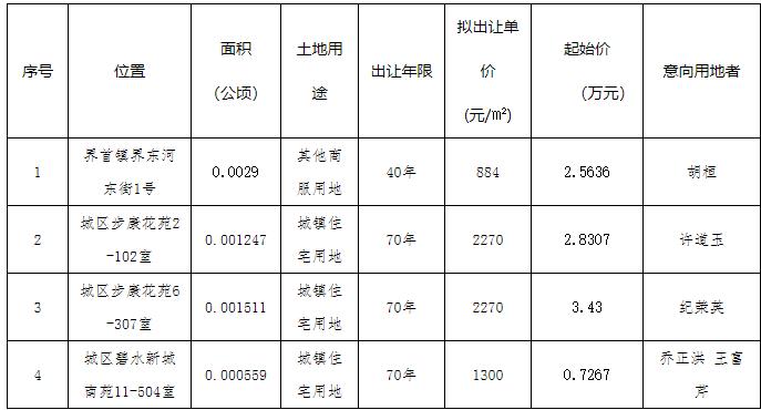 經(jīng)高郵市人民政府批準(zhǔn),高郵市自然資源和規(guī)劃局決定委托揚(yáng)州市公共資源交易中心高郵分中心以協(xié)議方式出讓4宗國有建設(shè)用地使用權(quán)。現(xiàn)根據(jù)有關(guān)法律、法規(guī)和國土資源部《協(xié)議出讓國有土地使用權(quán)規(guī)范(試行)》的規(guī)定,本著公開、公平、公正的原則,將擬出讓地塊的有關(guān)情況公示如下。